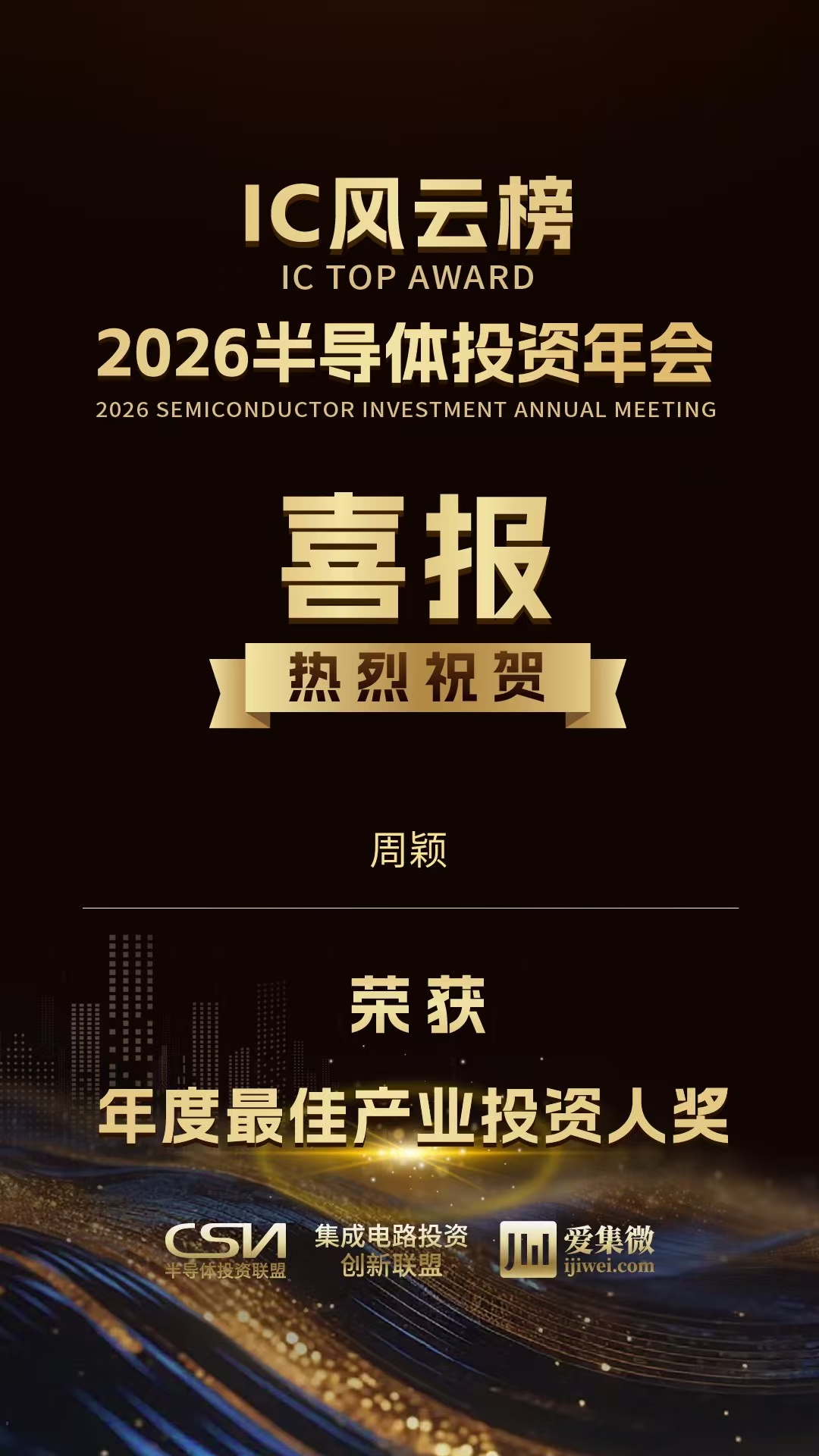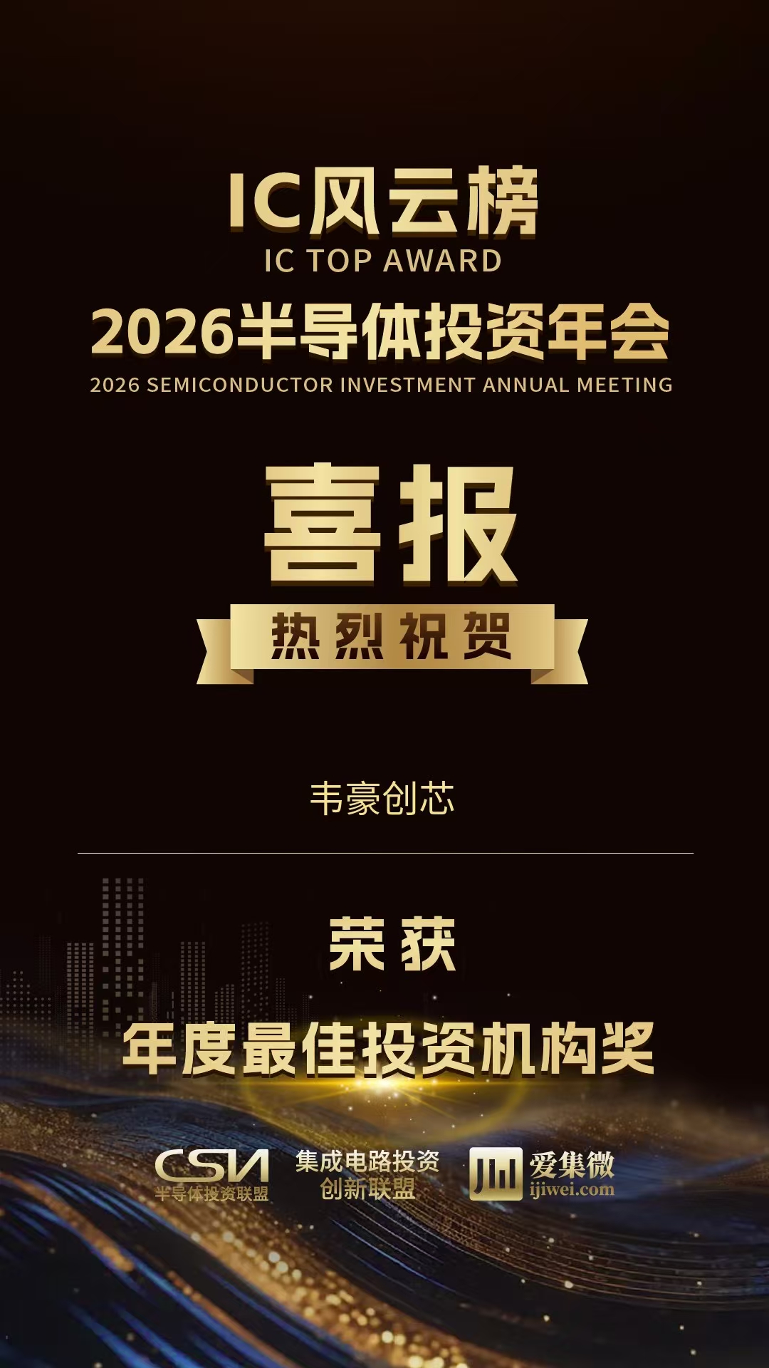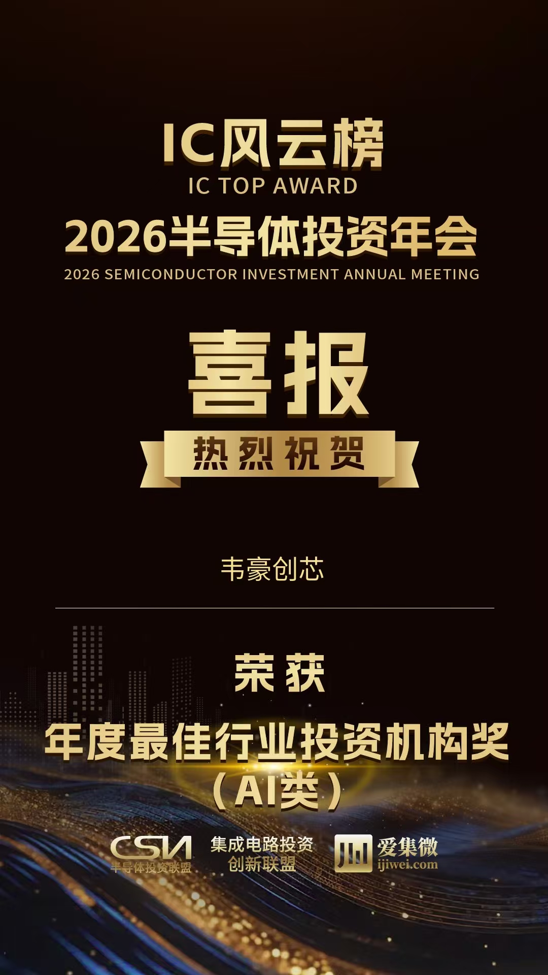 2025年12月20日,由半导体投资联盟和集成电路投资创新联盟主办、ICT知识产权发展联盟协办、爱集微承办的“2026半导体投资年会暨IC风云榜颁奖典礼”在上海隆重举行。上海韦豪创芯投资管理有限公司荣获“年度最佳投资机构奖”和“年度最佳行业投资机构奖(AI类)”,韦豪创芯投资总监周颖荣获“年度最佳产业投资人奖”。